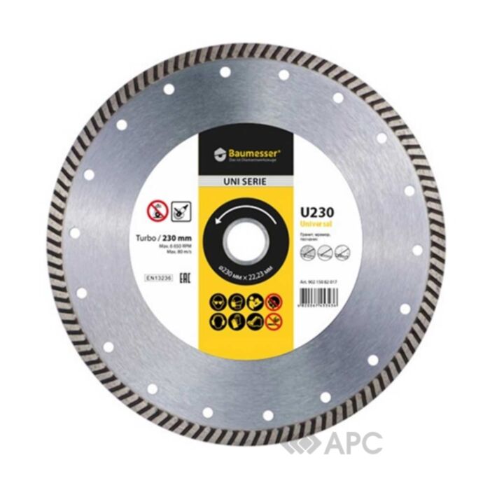Круг алмазный Baumesser Universal 90215129017 Turbo 230*2,3*9*22,23 мм подходит для бытового и профессионального использования. Режущий слой изделия максимально адаптирован под наиболее распространенные строительные материалы. В результате получается аккуратный, качественный и ровный срез без сколов, который не требует дополнительной обработки. Алмазный круг характеризуется стабильной режущей способностью, минимальной изнашиваемостью, продолжительным термином эксплуатации и возможностью работать с разными типами угловых шлифовальных машин.