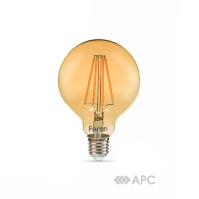 Светодиодная лампа Feron Filam LB-163 G95230V 6W E27 2700K золото — модель светодиодной лампочки с самым распространенным размером цоколя E27. Данный типоразмер до сих пор является универсальным для большинства бытовых источников света. Лампочки на основе светодиодов выгодно отличаются от ламп накаливания. Они более экономичны, а света дают больше, практически не нагреваются, работают в большем диапазоне температур. Таким образом они прекрасно подходят не только для внутреннего, но и для наружного освещения даже в морозы. Лампочки Feron — качество, надежность и экономия.