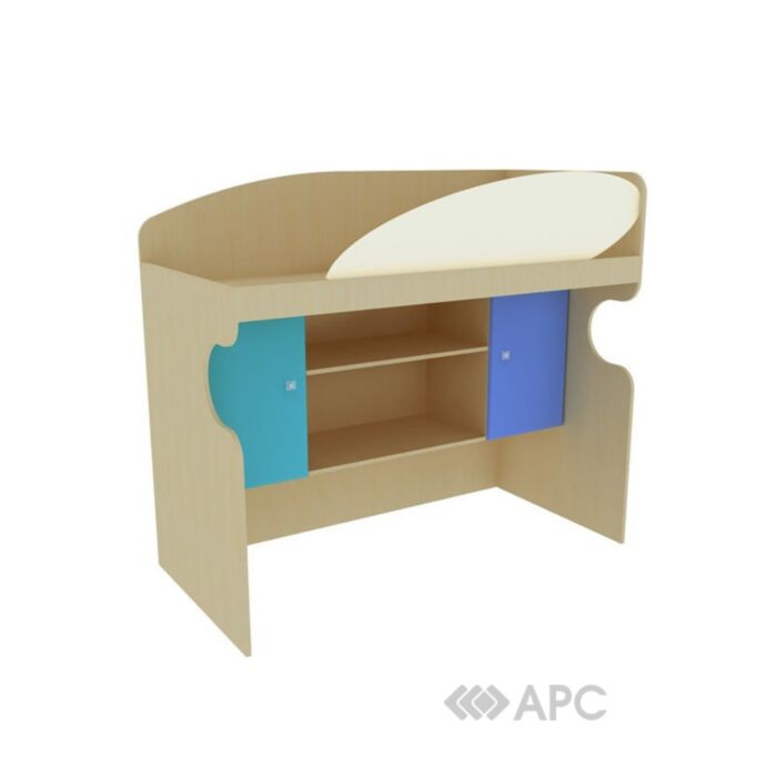 На верху - спальное место, внизу - два шкафчика и открытые полочки.
