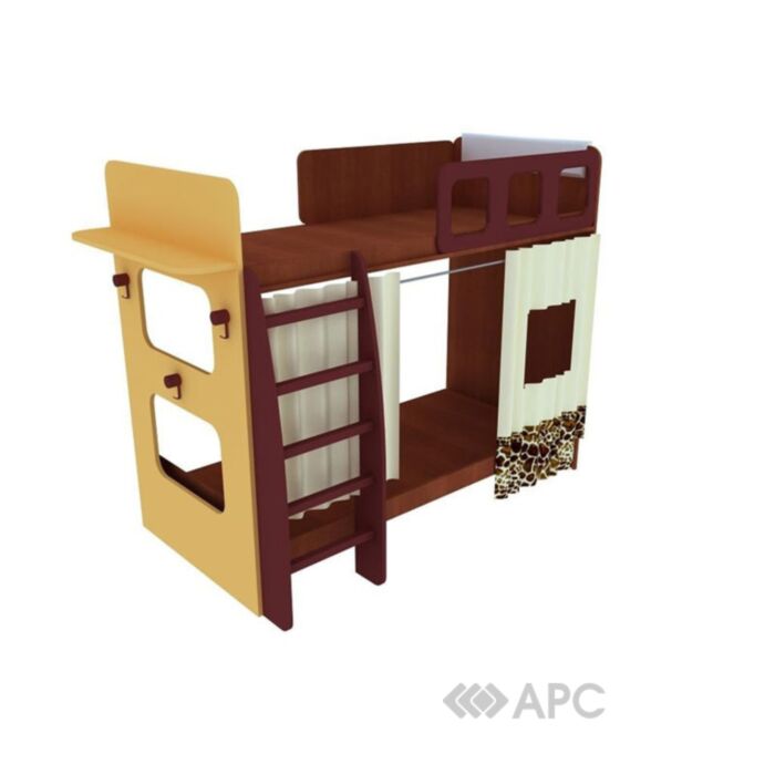Дополнительно может комплектоваться двумя выкатными ящиками (под нижнюю кровать) и шторками с тематическим рисунком (в данном случае, кремовый белый + пятнистый "Жираф").