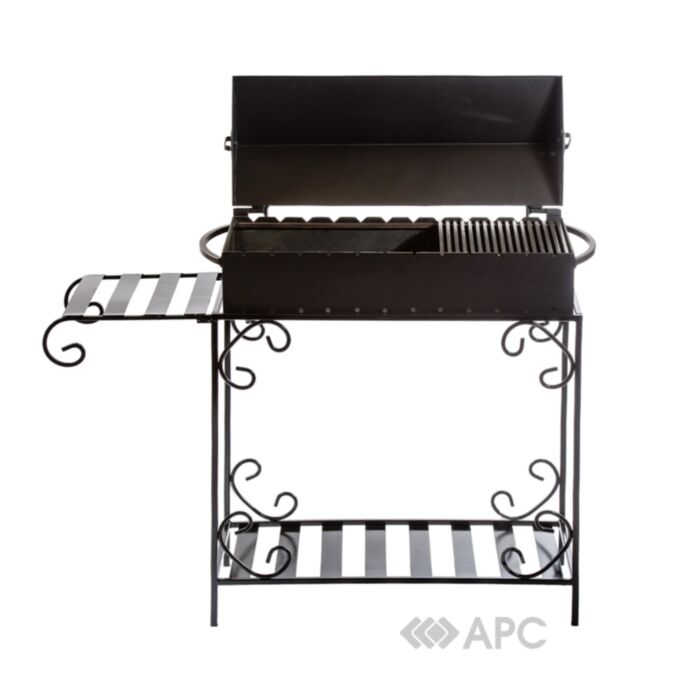 В комплектацию входит: металлическая решетка, боковая съемная полка-столик, усиленная кованая стойка с дровником и жаровня с крышкой-барбекю.