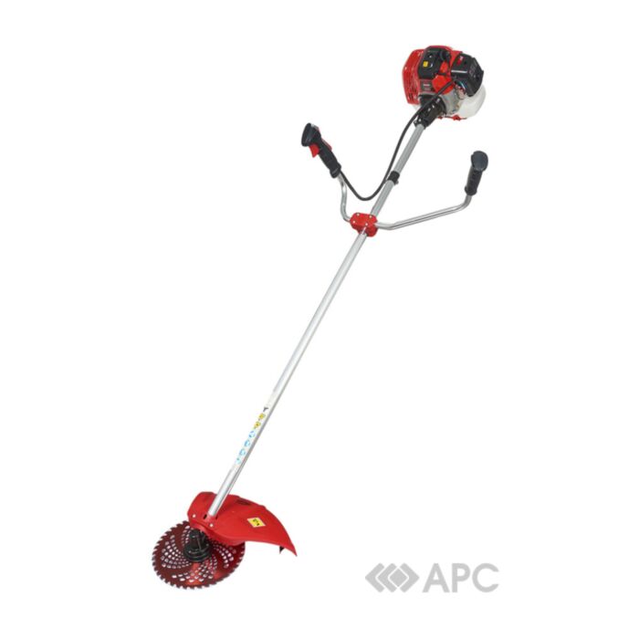 Мотокоса оснащена мощным бензиновым двигателем и функцией легкого старта. Рукоятки велосипедного типа уменьшают вибрационные волны, а ремневые крепления гарантируют удобный и комфортный рабочий процесс. Головки триммера может работать с леской 2,4 мм. Бензиновый бак рассчитан на 1,1 литра топлива. Ширина захвата леской 43 см, ширина скашивания ножом 25,5 см.