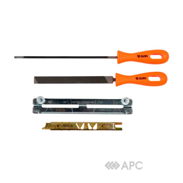 Комплект деталей YATO YT-85040 предназначен для заточки режущих цепей бензопил. Наличие стильного чехла позволяет надежно хранить инструменты и беречь их от воздействия внешней среды. В набор входят: плоский и круглый напильники, направляющая для напильника и шаблон для заточки ограничителя глубины.