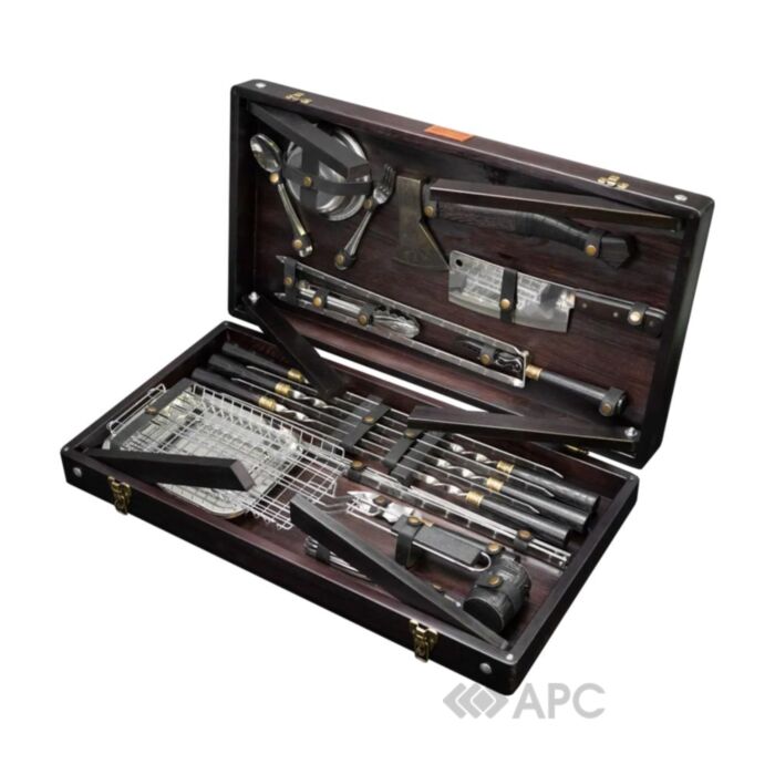 Набор для гриля Viking Create Валькирия WC-001 в кейсе 39 предметов - это настоящая находка для любителей барбекю, гриля и отдыха на природе. Стильный набор содержит инструменты, посуду и аксессуары с элегантными деревянными ручками. В комплект входят: шампуры (6 шт), двойной шампур, стойки мангала (2 шт), столовые ложки (4 шт), стопки (4 шт), штопор-открывалка, вилки столовые (4 шт), столовые ножи (4 шт), глубокие тарелки (4 шт), щипцы для мяса, металлические подносы (4 шт), решетка для гриля, топор, нож-тесак, нож-вилка для снятия мяса. Все предметы изготовлены из нержавеющей стали и дерева, что облегчает уход за ними и продлевает срок эксплуатации. Изысканный деревянный кейс добавляет эстетики и удобства в транспортировке. Он легко превратится в небольшой стол с помощью раскладных ножек. Набор станет отличным подарком для родных или друзей, которые любят проводить время на свежем воздухе.