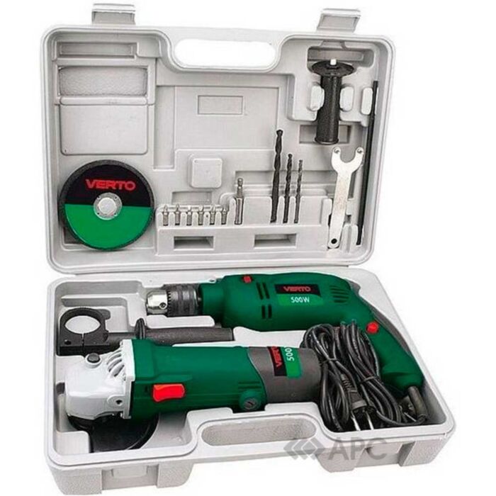 Набор электроинструмента VERTO в состав набора входят дрель ударная мощностью 500 Вт, с патроном под ключ 13 мм и машина шлифовальная угловая (болгарка) 500 Вт, для дисков диаметром 115 мм. Параметры электроинструментов, входящих в набор, позволяют выполнения мелких ремонтных работ, между прочим, для сверления отверстий с ударом в бетоне, без удара в дереве, керамике или стали, а также резки и шлифовки с помощью угловой шлифмашины. Соответствие европейским стандартам безопасности обеспечивается сертификатом CE. Марка VERTO предлагает ассортимент электроинструментов и принадлежностей для каждого мастера.