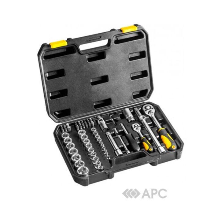Набор инструментов Topex 38D643 изготовлен из прочного и качественного материала — хромванадиевой стали. Пластиковый кейс защищает от повреждений, которые могут произойти во время транспортировки, а также от различных загрязнений. Набор состоит из 72 предмета, среди которых: трещотка, сменные головки, наконечники, шестигранные и комбинированные ключи, вороток и многое другое. Topex — польский бренд, который предлагает покупателям качественные товары по доступным ценам, поэтому неудивительно, что продукция пользуется спросом среди домашних мастеров.