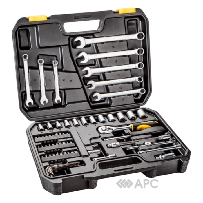 Набор инструментов Topex 38D645A изготовлен из прочного и качественного материала — хромванадиевой стали. Пластиковый кейс защищает от повреждений, которые могут произойти во время транспортировки, а также от различных загрязнений. Набор состоит из 71 предмета, среди которых: трещотка, сменные головки, наконечники, шестигранные и комбинированные ключи, вороток и многое другое. Topex — польский бренд, который предлагает покупателям качественные товары по доступным ценам, поэтому неудивительно, что продукция пользуется спросом среди домашних мастеров.