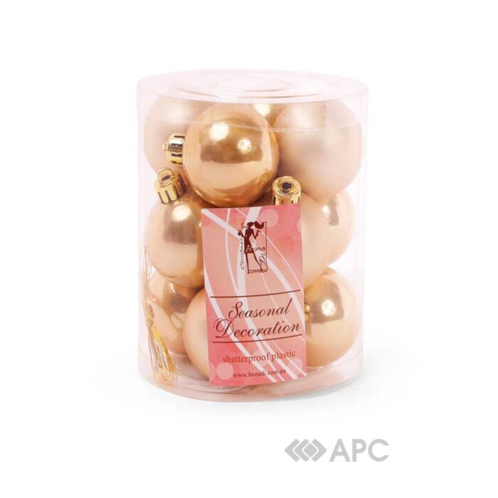 В набор входят пластмассовые елочные украшения цвет - светлое золото, 12шт: перламутр, матовый - по 6 шт