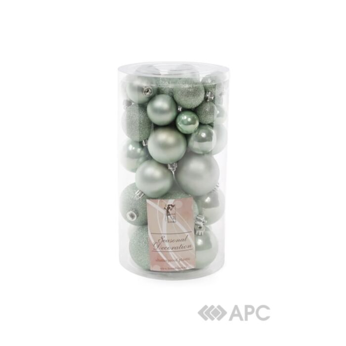 В набор входят пластмассовые елочные украшения цвета эвкалипт.