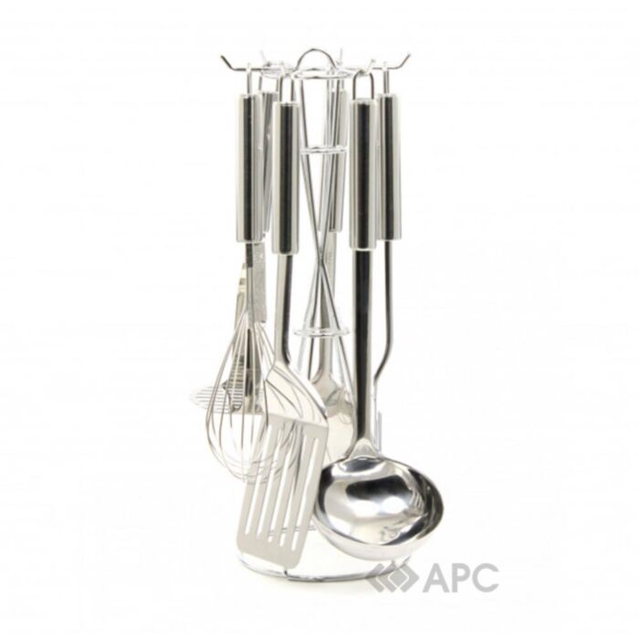 Поварский набор выполнен из высококачественной нержавеющей стали толщиной 1 мм. В комплекте собрание аксессуары, которые часто используются во время приготовления блюд. Изделия не создают постороннего привкуса и подходят для мытья в посудомоечной машине. В набор входит: половник, лопатка, ложка для спагетти, поварская ложка, поварская вилка, картофелемялка, подставка.