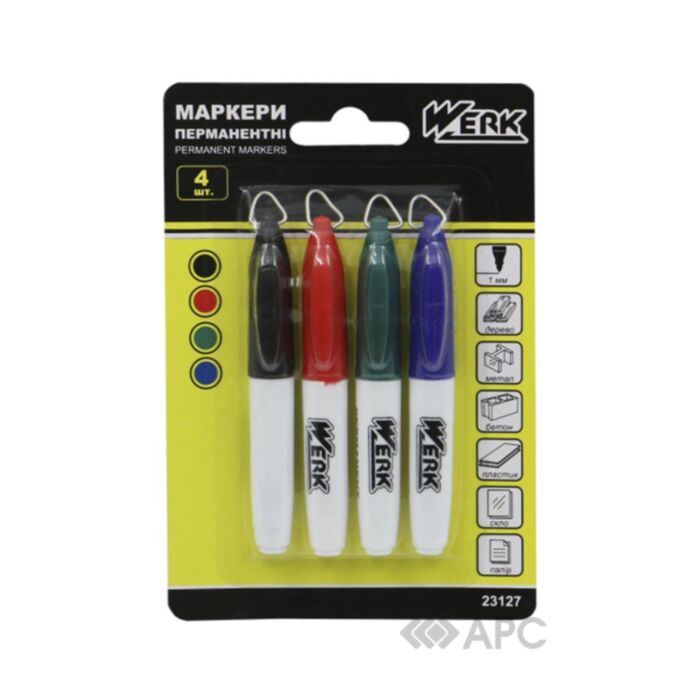 В набор WERK 23127 входят 4 маркера синего, зеленого, красного и черного цвета. Когда возникает необходимость произвести разметку или маркировку, хорошим вариантом решения данной задачи становится использование строительного маркера. Во время строительства, работы с электричеством или сантехникой пригодится перманентный маркер WERK. Чернила имеют стойкий цвет и быстро высыхают. Толщина линии зависит от плотности прилегания изделия к поверхности, показатель варьирует от 4 до 6 мм.