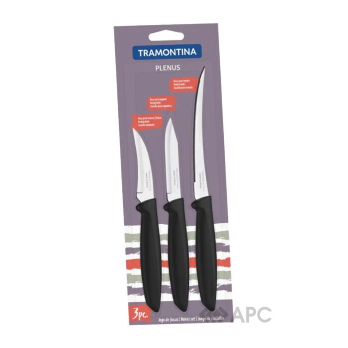 Набор ножей Tramontina Plenus black 23498/012 3 предмета изготовлен из высококачественной нержавеющей стали повышенной жесткости. Ножи удобны в использовании и очистке. Долго сохраняют остроту лезвия. В комплект входит: