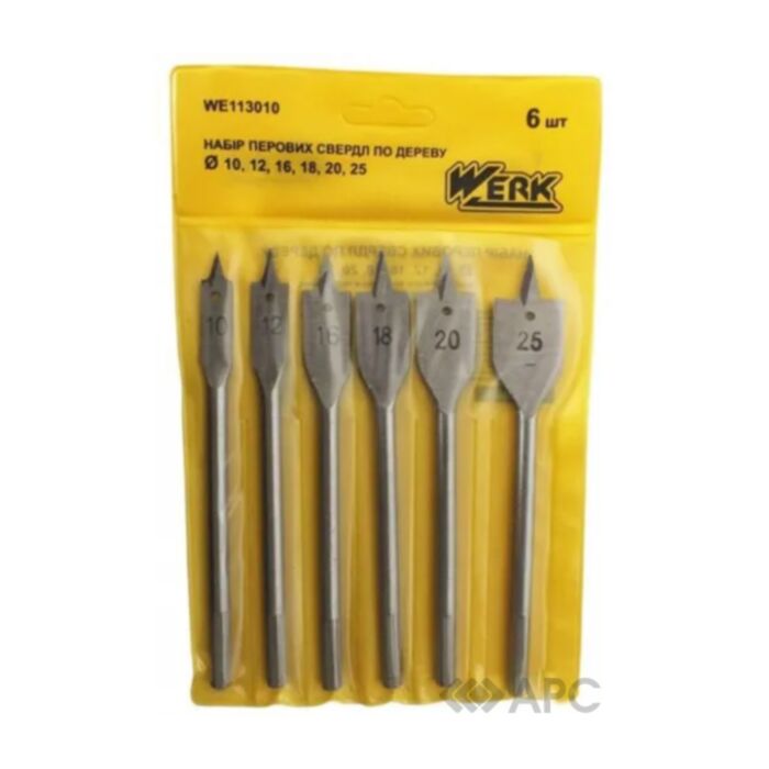 Набор перовых сверл по дереву WERK WE113010/2039804 6 шт — расходные материалы, используемые в работе с древесиной, фанерой и ДСП. Они производятся из высокоуглеродистой стали и отличаются прежде всего оригинальностью конструкции, представляющей собой металлический стержень с шестигранным окончанием и рабочей частью в виде пера. В набор входит 6 сверл диаметром 10, 12, 16, 18, 20, 25 мм. Купить набор перовых сверл по дереву можно в интернет-магазине АРС. У нас всегда актуальная и доступная цена. Доставка осуществляется по Украине - Киев, Харьков, Львов и др.