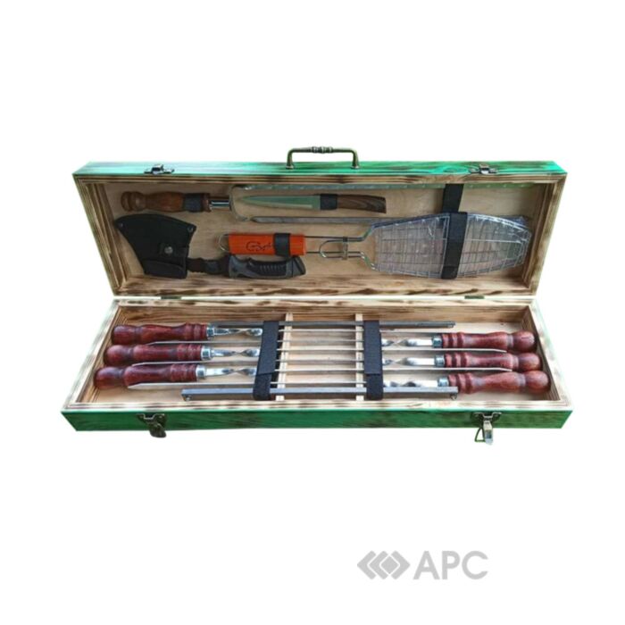 В состав набора входит сам деревянный кейс. Для непосредственного приготовления шашлыка предусмотрено шесть шампуров с деревянными ручками, выполненными в темном цвете. Металлическая часть является плоской и имеет спиральный изгиб ближе к ручке, что способствует равномерному прожариванию продуктов. Дополнительно включен один двойной шампур, предназначенный для удобного приготовления более крупных кусков мяса или птицы. Для рыбных блюд в комплекте имеется специальная решетка для рыбы. Для установки шампуров предусмотрена одна стойка-мангал. Также набор содержит удобный нож среднего размера и топор, что расширяет функциональность набора для подготовки дров и продуктов. Все компоненты набора, позволяющие приготовить разнообразную пищу на огне, изготовленные из качественных материалов.