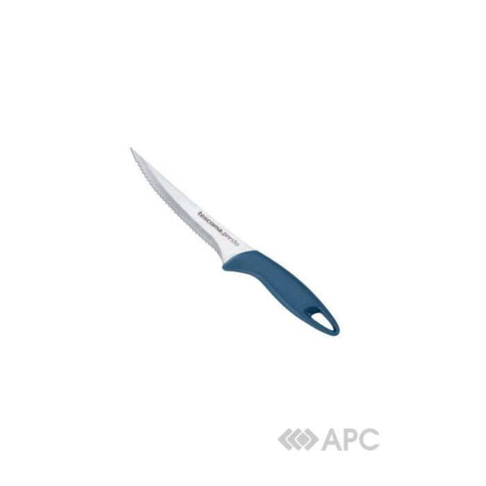 Нож для стейков Tescoma PRESTO 863011 12см хорошо справляется с сырым или запеченным мясом. Острое лезвие без особых усилий нарезает стейки, не деформируя края и сохраняя аккуратную форму блюда.