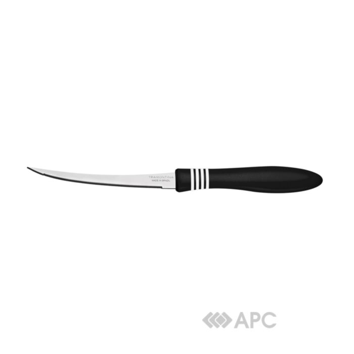 Нож для томатов Tramontina COR&COR — это замечательный, а также качественный инструмент для нарезки помидор и других овощей или фруктов. Сделан из нержавеющей стали, и полипропилена. Лезвие с зубчиками отлично справляется со своей задачей, а также не деформируется после использования. Ручка всадного типа крепления с нескользящим покрытием. Длина 102 мм. Удобный да простой в уходе: можно мыть во посудомоечной машине, после мытья его следует насухо вытирать.