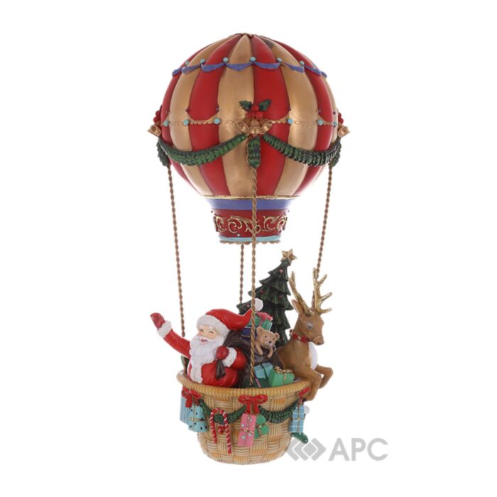 Санта вместе с оленем сидит в празднично украшенном воздушном шаре, рядом с мешком подарков, готовых к раздаче. Позади них расположена елка, что добавляет композиции еще больше новогоднего настроения. Эта статуэтка передает атмосферу волшебного полета, в котором Санта доставляет радость по всему миру. Украшение станет замечательным дополнением к праздничному декору, наполняя дом теплом, чудом и предвкушением сказочных моментов.