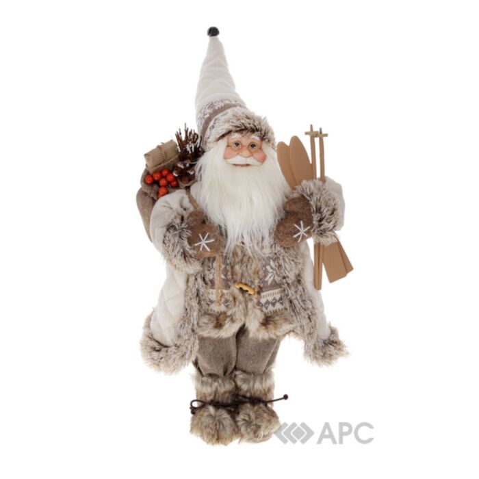 Новогодняя игрушка Санта с подарками BonaDi 45 см бежевая — это настоящий художественный элемент, наполняющий дом теплом и праздничной атмосферой. Она станет идеальным подарком и будет доставлять радость детям, взрослым и гостям дома. Представляет собой фигурку улыбающегося Санты, который спешит на лыжах раздать презенты всем желающим: на руках у него перчатки, а в мешке — зимние ягоды, посыпанные снегом и подарки. Образ дополняют меховые сапожки, кожух и теплый колпак. Цветовая гамма выполнена в приятных бежевых и коричневых оттенках, поэтому обязательно дополнит любой интерьер.