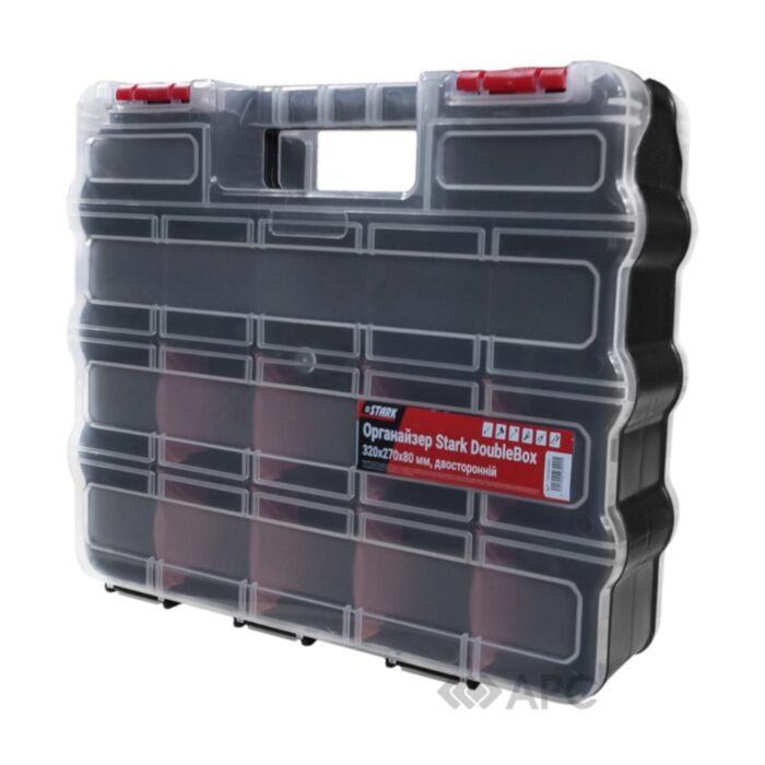 Органайзер STARK DoubleBox 100003001 двухсторонний 320*270*80 мм - станет прекрасным местом для хранения мелких элементов для ремонта, которые часто используются в домашнем хозяйстве. Такой кейс может значительно продлить срок эксплуатации набора ключей, отверток, шурупов и других негабаритных инструментов настоящего мастера, благодаря защите от проникновения влаги, прямых солнечных лучей и др. Кейс отличается легкостью и мобильностью, что очень важно при его транспортировке. Однако, материал может пострадать от сильных ударов и механических повреждений. Перегружать его также не стоит. Такой органайзер поможет сохранить все инструменты в чистоте и порядке.