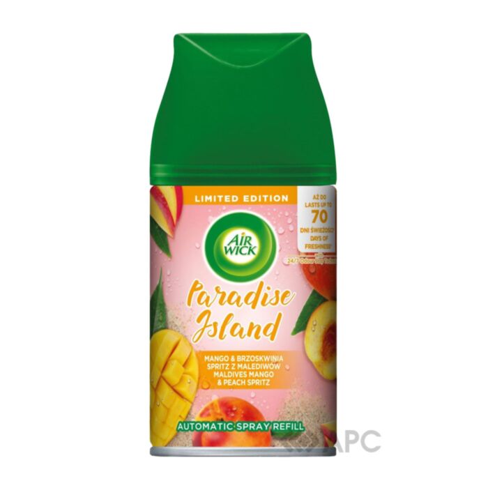 Освежитель воздуха Air Wick Спелый манго– сменный баллон на 250 мл для автоматического устройства. Средство помогает на мгновение перенестись на песчаное побережье, насладиться ароматом манго. Эффективно устраняет даже стойкие неприятные запахи, а не маскирует их на короткий период. Действует мгновенно, распространяя легкий шлейф по всей квартире.