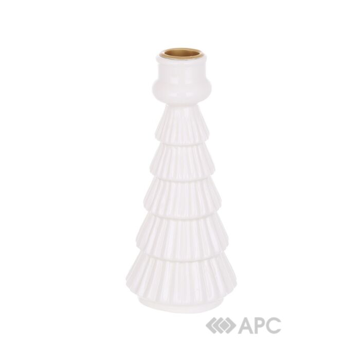 Изготовлен из керамики снежно-белого цвета с глянцевым покрытием. Его форма имитирует елку, стилизованную в виде нескольких ярусов с рельефной, гофрированной поверхностью. Сверху расположено углубление для свечи (диаметром 22 мм), оформленное декоративной манжетой золотистого цвета. Подсвечник имеет диаметр основания 7,5 см и благодаря своему минималистичному дизайну гармонично впишется в любой современный интерьер.