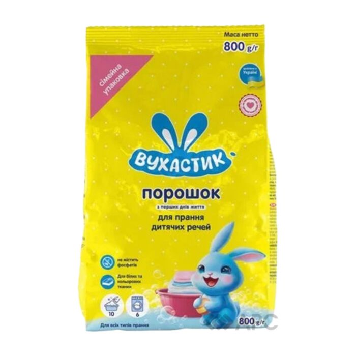 Стиральный порошок Вухастик автомат 800 г – это универсальное средство, подходящее как для ручной так и машинной стирки. Он помогает очищать любые загрязнения именно на детской одежде. Поскольку кожа малышей очень нежная и подвержена аллергическим реакциям, то она нуждается в особенно мягком уходе, с исключением всех вредных веществ, поэтому состав данного средства полностью безопасен.
