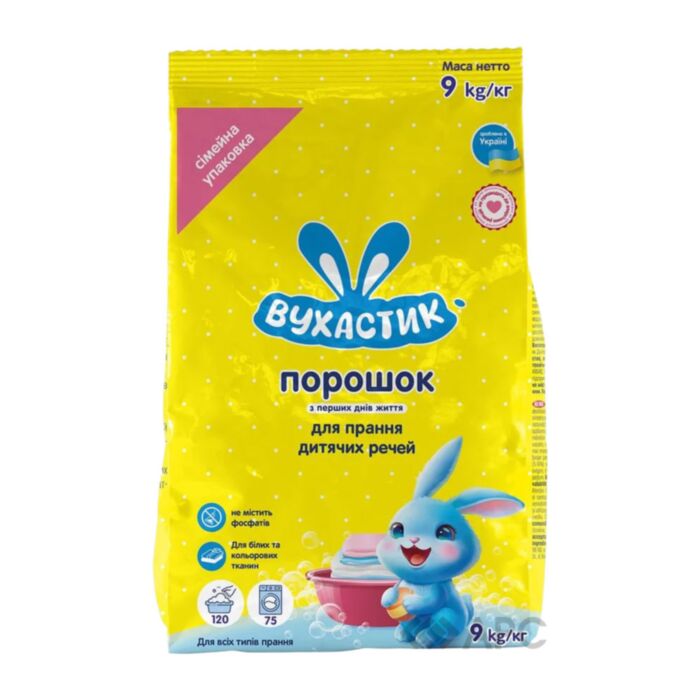 Стиральный порошок Вухастик автомат 9 кг – это универсальное средство, подходящее как для ручной так и машинной стирки. Он помогает очищать любые загрязнения именно на детской одежде. Поскольку кожа малышей очень нежная и подвержена аллергическим реакциям, то она нуждается в особенно мягком уходе, с исключением всех вредных веществ, поэтому состав данного средства полностью безопасен.