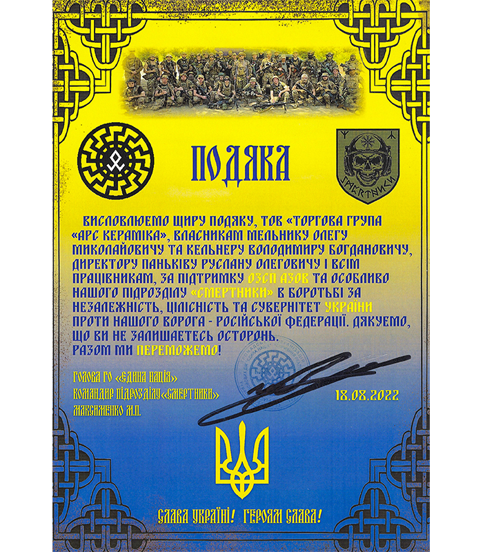 Дякуємо торговій групі за значний внесок у функціонування нашого центру. Ваша фінансова допомога сприяла реалізації ініціатив на підтримку діючих бійців амуніцією та військовим забезпеченням, що значно покращила комфорт та безпеку в зоні бойових дій. Продовжуючи співпрацю з компанієї АРС, ми віримо в подальший успіх майбутніх проєктів для Збройних Сил України.