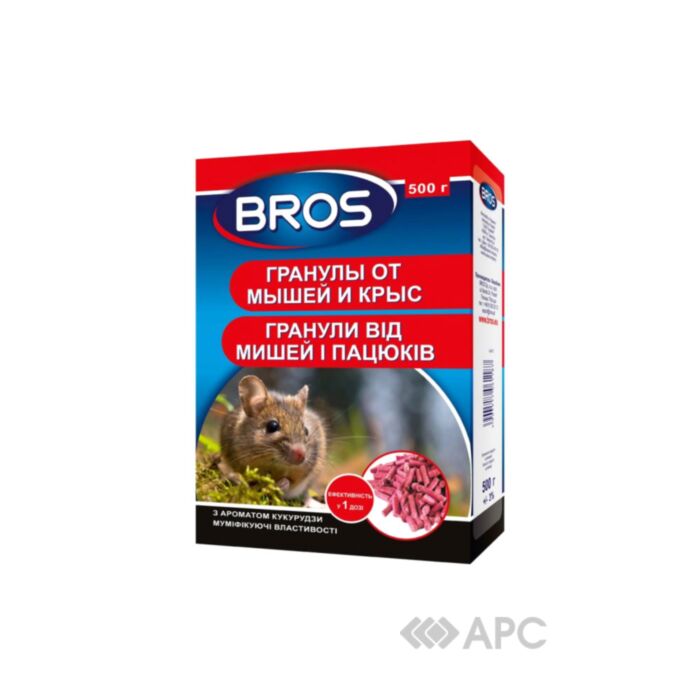 Купить родентицидное средство Bros гранулы от мышей и крыс в упаковке на 500 г можно в интернет-магазине АРС с доставкой по всей территории Украины.