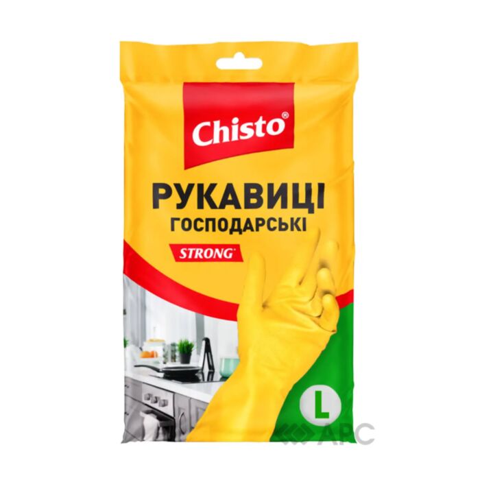 Перчатки латексные Chisto — это хозяйственное защитное средство, защищающее руки от различных вредных растворов и веществ при уборке или мытье посуды. Изготовлены из крепкого, эластичного латекса, желтого цвета, имеют высокие манжеты. Рифленая рабочая поверхность предотвращает ускользание предметов из рук. Внутреннее хлопковое покрытие помогает легко одевать и снимать рукавицы. Подлежат многократному использованию, размер L.