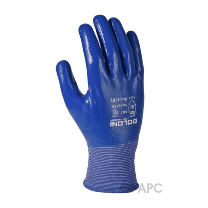 Перчатки рабочие Doloni 4581— трикотажные полиэстеровые перчатки с нитриловым покрытием (3/4 поверхности). Соответствие характеристикам стандарта устойчивости к механическим рискам класса 4122. Перчатки дают прекрасную защиту от контакта с жидкостями, грязью, жиром, маслами, бензином и т.д. При этом сохраняется достаточно высокая чувствительность пальцев и вентиляция, благодаря чему руки практически не потеют.