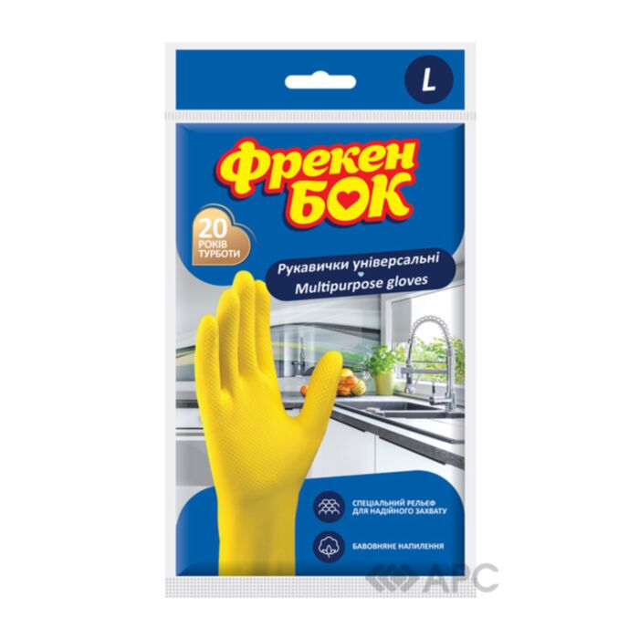 Перчатки универсальные Фрекен Бок L — это хозяйственное защитное средство, защищающее руки от различных вредных растворов и веществ при уборке или мытье посуды. Изготовлены из крепкого, эластичного латекса, желтого цвета, имеют высокие манжеты. Рифленая рабочая поверхность предотвращает ускользание предметов из рук. Внутреннее хлопковое покрытие помогает легко одевать и снимать рукавицы. Подлежат многократному использованию, размер L.