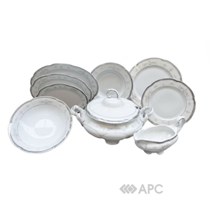 Его дизайн, представленный на картинке, отличается классической формой с волнистыми краями и изящным орнаментом в серо-серебристых тонах (платина). Сервиз идеально подходит для торжественной и аристократической сервировки стола. Важной особенностью является то, что его не рекомендуется мыть в посудомоечной машине. Это сохранит его элегантность в течение многих лет.