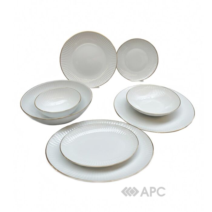 Сервиз столовый Cmielow Dalia 3612 6 персон 24 предмета – это изысканное и функциональное решение для сервировки стола, идеально подходящего как для повседневного использования, так и для торжественных событий. Изготовленный известной польской фабрикой Cmielow, которая славится своей многолетней историей и высоким качеством фарфора, этот сервиз объединяет традиции и современный дизайн. Комплект выполнен из высококачественного белого фарфора. Дизайн отличается классической элегантностью: он включает в себя рельефную плиссированную отделку по краям и изящную золотую кайму, идеально подходящую для праздничной и торжественной сервировки. В комплект входит 6 обеденных тарелок (26 см), 6 суповых (21,5 см), 6 салатных (21 см), 2 салатника (17 см, 26 см), 3 овальных тарелки (24 см, 24 см, 33 см), блюдо круглое 1 шт. Фарфор Cmielow отличается высокой прочностью, стойкостью к царапинам и способностью сохранять свой первоначальный вид даже при частом использовании.