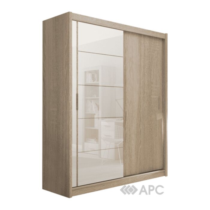 Просторный шкаф с раздвижными дверями из коллекции мебели Fado. Естественные цвета дополнены серыми вставками на фронтах, которые характерны для данной коллекции. Поверхность фасадов также разделена зеркалами, которые оптически увеличивают площадь спальни. Интерьер гардероба можно свободно использовать, благодаря дополнительным внутренним полкам.
