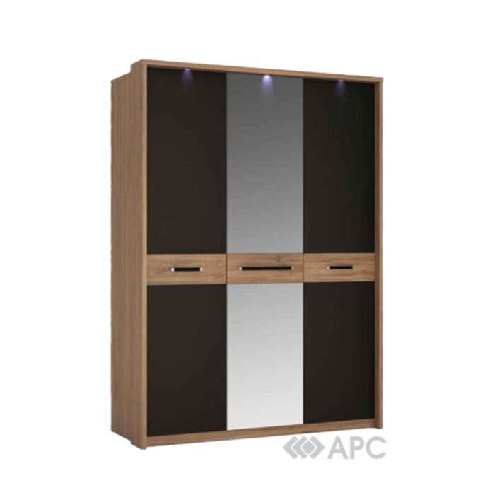 Шкаф 3D Monaco MOAS01 от модульной системы Monaco Польской фабрики Wójcik. Состоит из трехдверной части с зеркалом, внутри которого есть пять полок и штанга.