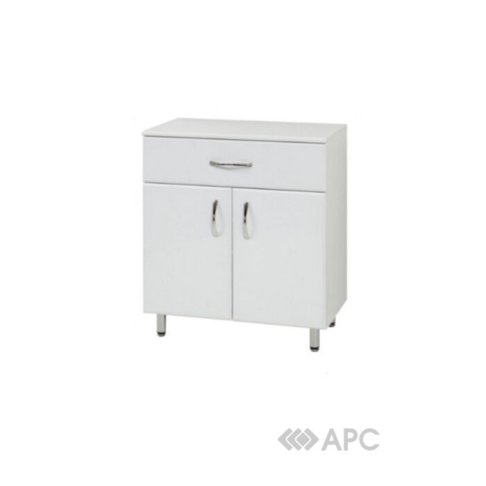 Комод напольный для ванной комнаты с 2 полочками внутри и 1 ящиком. Корпус выполнен из ДСП с двухсторонней ламинацией белого цвета, толщина 16 мм.