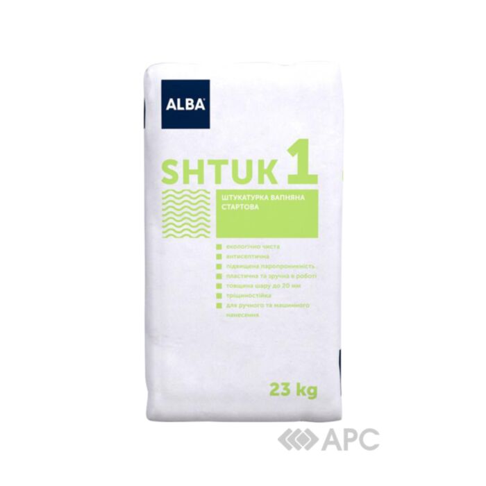 Штукатурка стартовая Альба SHTUK-1 23 кг - стартовая белая шпаклевка на известковой основе для внутренних работ. Высококачественная смесь легкая и очень удобная в использовании. С ее помощью выравниваются штукатурные, гипсовые, бетонные и кирпичные основания, а также заделываются трещины, швы и дыры.