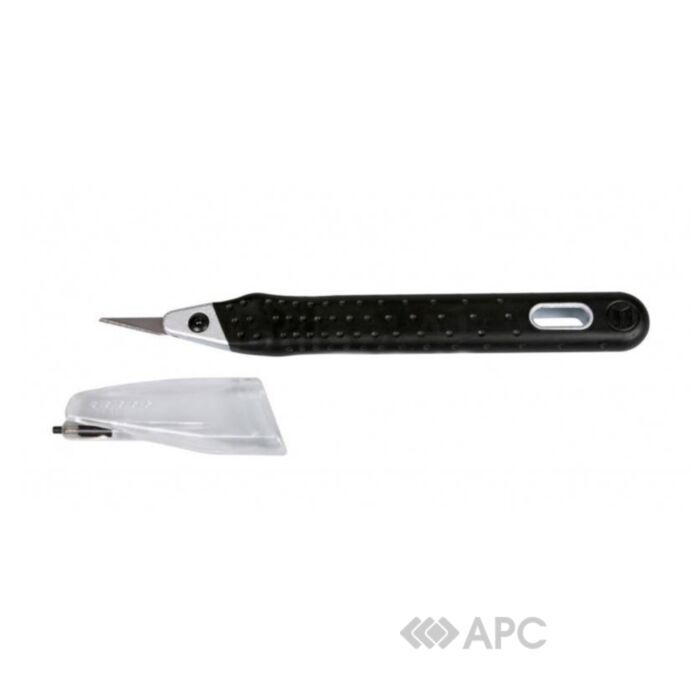 Скальпель, ручка 2К, Hardy 0510-400026 состоит из прочной эргономичной двухкомпонентной ручки наивысшего качества и острых металлических лезвий, которые подходят для аккуратной и точной резки бумаги и картона, а также пластика, резины и дерева в процессе создания разных моделей. Корпус изделия имеет рифленую структуру, что не дает ему скользить в руке. В комплект входит пластиковый пенал со сменными лезвиями, запаса которых хватает на несколько лет.