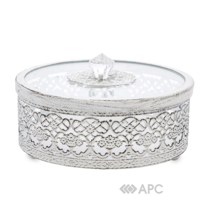 Шкатулка металлическая Art-Pol — это своего рода органайзер, предназначенный для хранения разнообразных украшений, аксессуаров, косметических средств и других мелких вещей. Обладает стильным, оригинальным дизайном. Имеет круглую форму и крышку с хрустальной ручкой. Стенки украшены декоративными элементами, поэтому изделие создает хорошее настроение, а также дарит приятные эмоции. Сделана из металла в белом цвете, подходит практически к любому дизайну интерьера. Станет отличным подарком для любой женщины. Размеры товара 8х14,5 см.