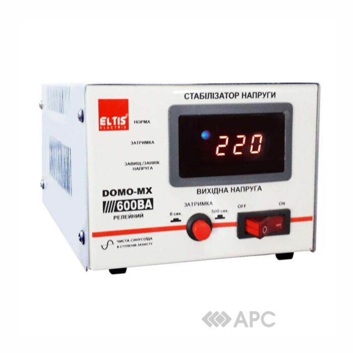 Стабилизатор напряжения Eltis DOMO-600MX 01085 является однофазным релейным устройством, позиционируемым как наиболее экономичное решение для стабилизации напряжения одного или нескольких бытовых энергопотребителей, и рекомендованным для установки с холодильным оборудованием. Устройство имеет полную мощность 600 ВА с возможностью пиковой перегрузки до 2500 ВА и работает в диапазоне входного напряжения от 140 В до 260 В. Выходное напряжение составляет 220 В с точностью стабилизации ±8 %. Управление схемой осуществляется микропроцессорно, а время реакции на изменение входного напряжения составляет менее 100 мс. Стабилизатор имеет высокий КПД >98 %, пассивное охлаждение и степень защиты IP20. Он оснащен надежной системой защиты, которая включает термопредохранитель и токоизмерительный трансформатор от превышения номинальной нагрузки, а также защиту от повышения 248 В и понижения 186 В выходного напряжения. Для безопасного запуска оборудования предусмотрены два режима задержки включения: короткая (6 сек.) и длинная (500 сек.), а контроль параметров обеспечивается LED цифровой индикацией. Габаритные размеры стабилизатора (ВхШхГ) составляют 102 мм - 135 мм - 230 мм.