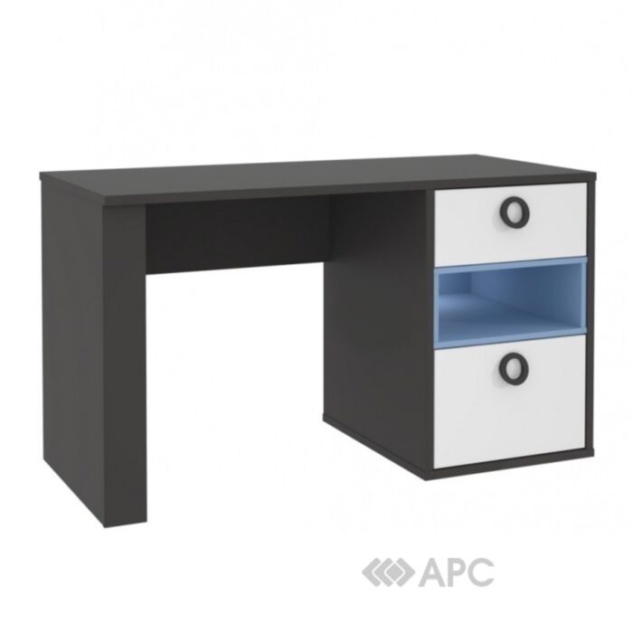 Стол письменный COLORS - это сочетание функциональности и того, что необходимо в комнате для подростков современных решений. Корпус стола доступен в Uni Wolfram Grey с белыми фронтами и синим акцентом в виде функционального углубления. Цвет и стиль адаптированы к другой молодежной мебели из коллекции COLORS.