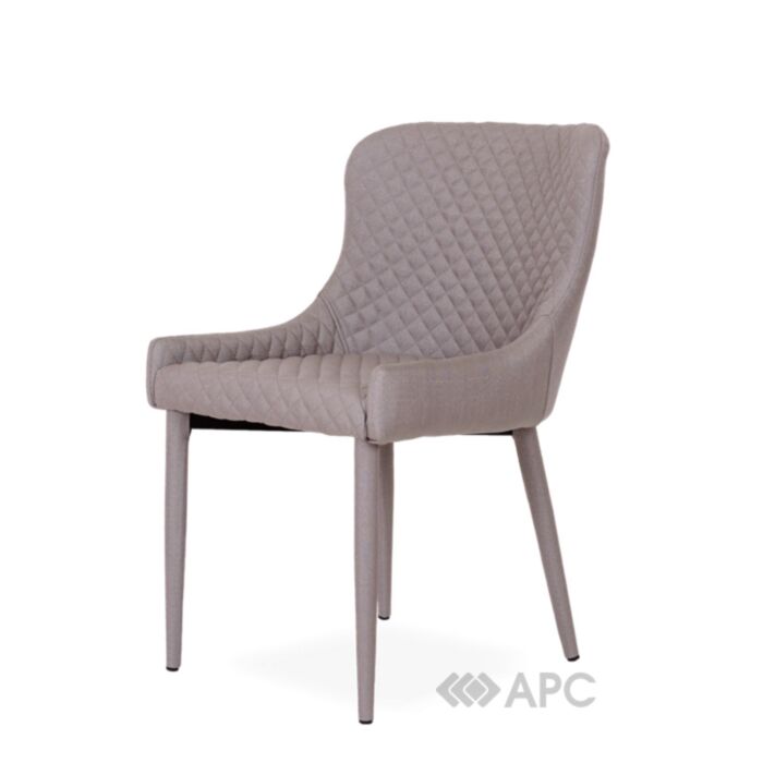 Каркас стула изготовлен из металла, ножки также металл обтянут тканью и соединены проногой из хромированного металла. Выгнутая для удобства прямоугольная спинка с чуть скругленными краями и мягкое сиденье обтянуты стеганой тканью.
