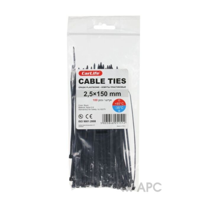Стяжка CarLife 2,5*150 мм черная 100 шт предназначена для сборки кабелей и проводов в аккуратные пучки. Значительно упрощают работу с мощными электрическими системами, техникой, электроникой с огромным количеством проводки. Также будет полезен такой хомут и в обиходе, для упорядочения большого количества проводов, которые часто можно найти под рабочим столом или у телевизора. Данную стяжку можно использовать и для крепления других элементов небольшого веса.