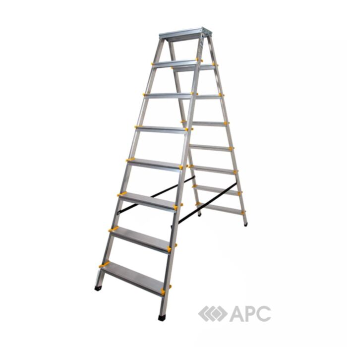 двухсторонняя металлическая стремянка Меткас производится из прочного профиля и оснащена широкими ступенями с антискользящим покрытием для безопасных спусков и подъемов. Дополнительные резиновые накладки на ножках обеспечивают устойчивость лестницы, а также сохранность напольного покрытия от царапин и повреждений. В сложенном виде стремянка очень компактная и удобная для хранения.