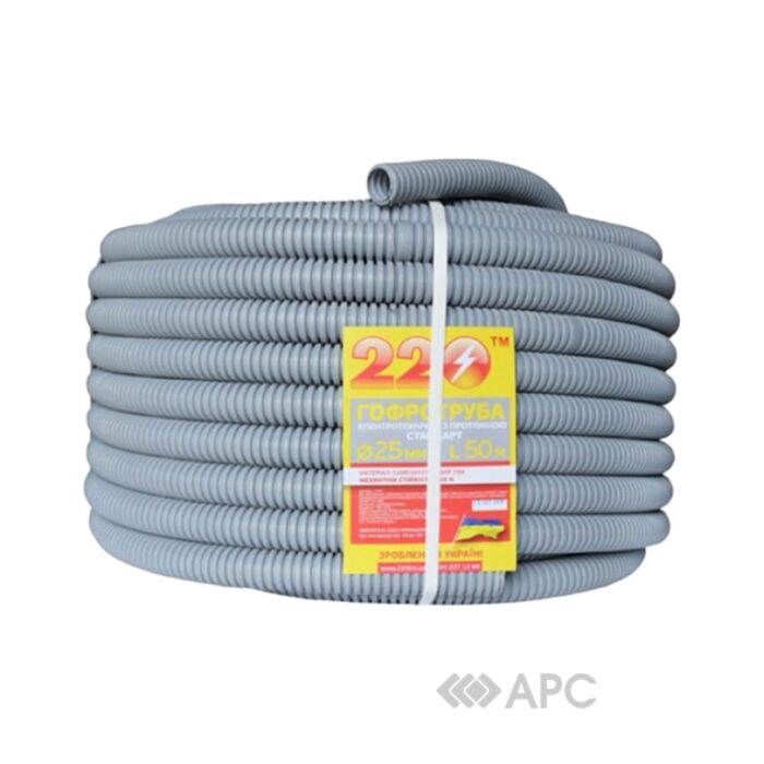Труба гофрированная ТМ 220 25 мм серая изготавливается из негорючего поливинилхлорида. Изделие применяется в процессе монтажа электросетей в полах и стенах. Гибкая гофротруба подходит для открытой установки внутри помещения, но использования на внешней стороне здания лучше избегать, поскольку структура трубы под действием ультрафиолета покрывается трещинами.