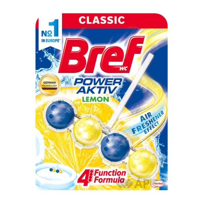 Туалетный блок Bref Сила Актив Лимон 50 г - это надежный барьер от известкового налета и неприятного запаха на каждый день. Он размещается на ободке унитаза и обеспечивает его чистоту после каждого смывания. Цветные шарики сочетают функции очистки и дезинфекции, оставляя блеск и чистоту поверхности. Инновационная формула цветной воды защищает от известкового налета и других загрязнений в течение 4 недель. Активная пена уничтожает бактерии и микробы, устраняет неприятный запах. Элегантный лимонный аромат освежает воздух ванной комнаты. Bref Сила актив экономное в использовании и эффективное средство для ежедневной гигиены туалета.