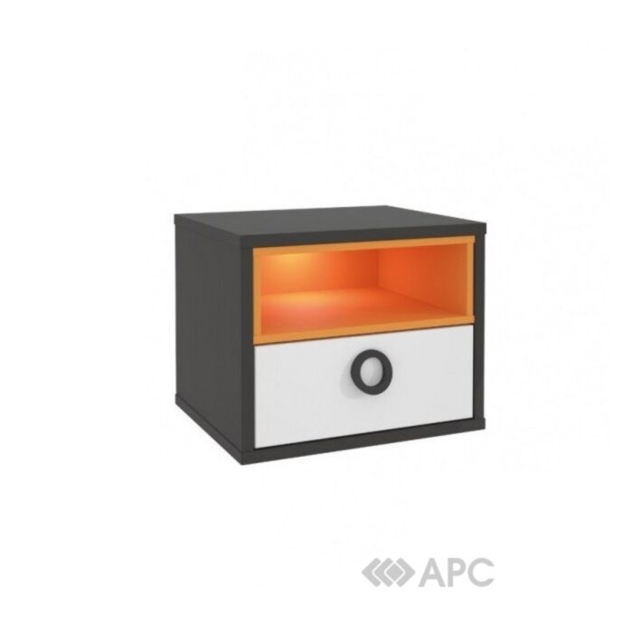 Тумба прикроватная COLORS - идеальное дополнение уютному уголку для отдыха в комнате для подростков. Бело-серая цветовая схема была оживлена энергичным оранжевым цветом, что применяется во внутренней части открытой полки. Дополнительная подсветка, которая может быть установлена в глубине, освещает мебель и предметы, которие в нем хранятся. Верх тумбы - идеальное место для прикроватной лампы и любимой книги.