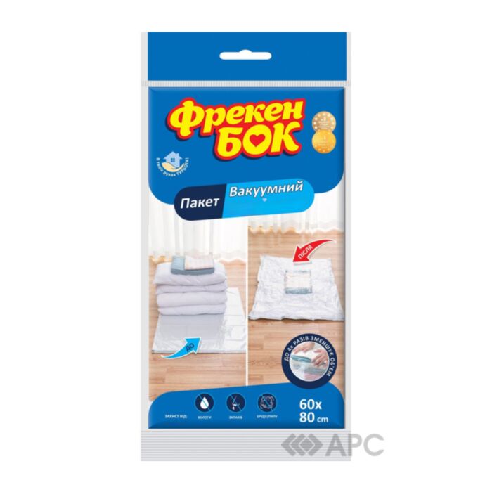 Фрекен Бок для вещей 60*80 см – вакуумный пакет для хранения вещей. Удобный и практичный способ значительно уменьшить объем вещей, которые не используются в данное время: одежды, подушек, мягких игрушек, постельного белья. При таком способе хранения исключается появление неприятных запахов, грибка, накопления пыли, грязи, влаги и так далее. Главным достоинством, естественно, является значительная экономия пространства. Размер пакета составляет 50*60 см, что позволяет вместить значительное количество вещей. Выкачать воздух из пакета можно при помощи обычного бытового пылесоса. Замок Zip-lock обеспечивает надежное герметичное закрытие.