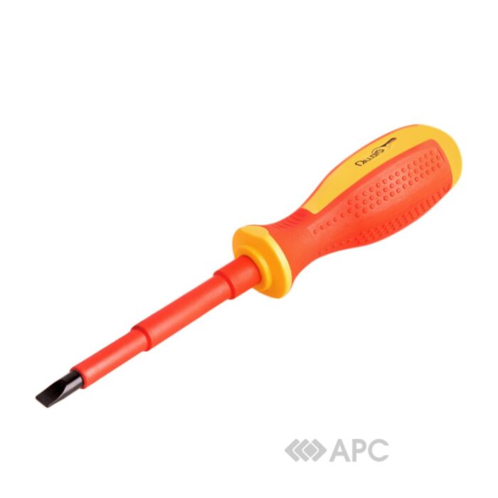 Отвертка шлицевая Alloid — это инструмент, который используется для откручивания и закручивания винтов, шурупов и других резьбовых деталей, содержащих паз. Рабочая часть изготавливается из хром–никель-молибдено– ванадиевой стали, что характеризуется прочностью, а также износостойкостью. Прямая ручка сделана из качественного прорезиненого пластика, имеет эргономичную форму. Инструмент очень хорошо изолирован, изоляция выдерживает до 1000 В. Такая отвертка идеально защищает от непреднамеренного удара током при работе с клеммами и контактами, а также элементами, которые не удалось полностью изолировать.